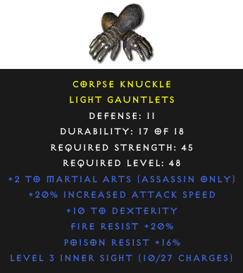 Required Level: 48Defense: 11+2 to Martial Arts (Assassin only)+20% Increased Attack Speed+10 to DexterityPoison Resist +16%Fire Resist +20%