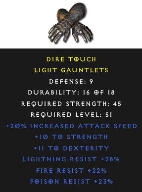 Required Level: 51Defense: 9+20% Increased Attack Speed+10 to Strength+11 to DexterityPoison Resist +23%Lightning Resist +28%Fire Resist +22%