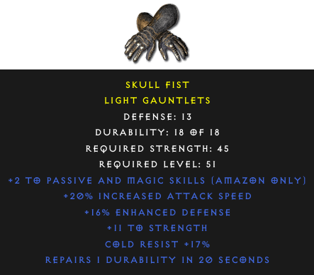 Required Level: 51Defense: 13+2 to Passive and Magic Skills (Amazon only)+20% Increased Attack Speed+11 to StrengthCold Resist +17%+16% Enhanced DefenseRepairs Durability