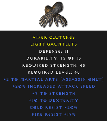 Light Gauntlets: Viper ClutchesRequired Level: 48 Rarity: rare | Select the realm to see the price |