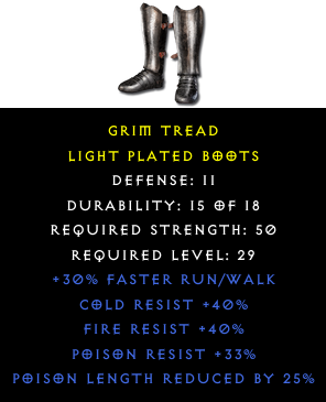Required Level: 29Defense: 11+30% Faster Run/WalkPoison Resist +33%Cold Resist +40%Fire Resist +40%Poison Length Reduced by 25%
