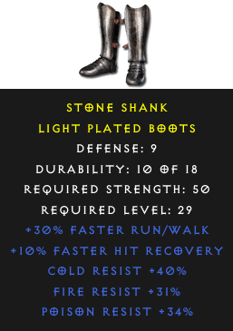 Required Level: 29Defense: 9+10% Faster Hit Recovery+30% Faster Run/WalkPoison Resist +34%Cold Resist +40%Fire Resist +31%