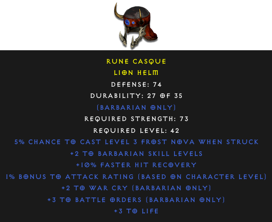 Lion Helm: Rune CasqueRequired Level: 42 Rarity: rare | Select the realm to see the price |