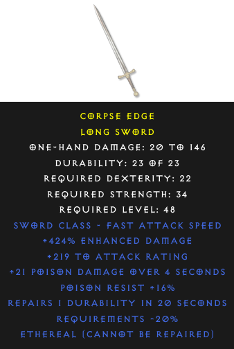Required Level: 48+219 to Attack RatingPoison Resist +16%+424% Enhanced DamageRepairs Durability21 Poison Damage over timeRequirements -20%