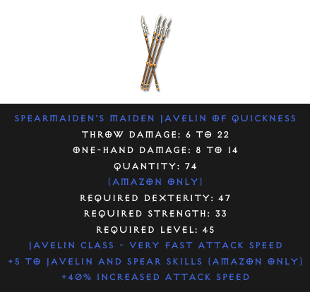 Required Level: 45+5 to Javelin and Spear Skills (Amazon only)+40% Increased Attack Speed