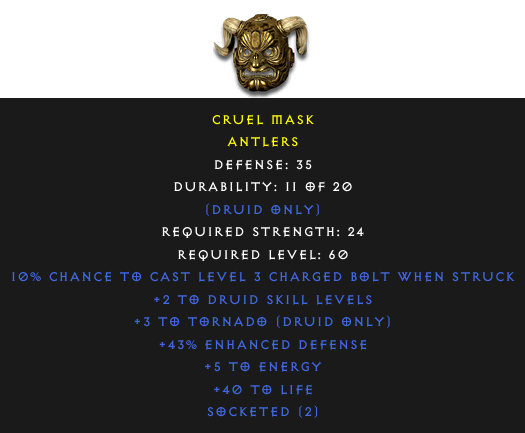 Required Level: 60+2 to Druid Skill LevelsDefense: 35+3 to Tornado (Druid only)Socketed (2)+40 to Life+43% Enhanced Defense+5 to Energy