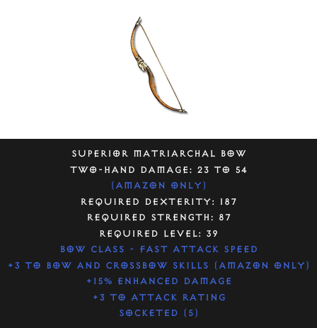 Required Level: 39+3 to Bow and Crossbow Skills (Amazon only)Socketed (5)+3 to Attack Rating+15% Enhanced Damage