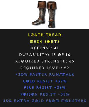 Required Level: 29Defense: 41+30% Faster Run/WalkPoison Resist +35%Cold Resist +37%Fire Resist +36%45% Extra Gold from Monsters