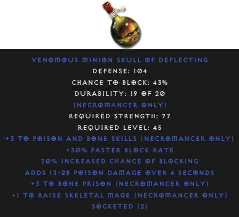 Minion Skull: Venomous Minion Skull Of DeflectingRequired Level: 45 Rarity: magic | Select the realm to see the price |