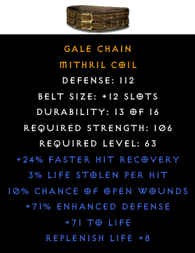 Required Level: 63Defense: 112+24% Faster Hit RecoveryReplenish Life +8+71 to Life+71% Enhanced Defense10% Chance of Open Wounds3% Life stolen per hit