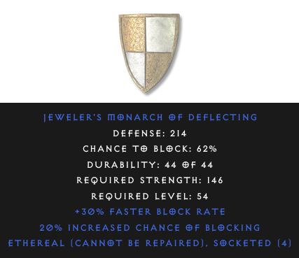 Required Level: 54Defense: 21420% Increased Chance of Blocking+30% Faster Block RateSocketed (4)