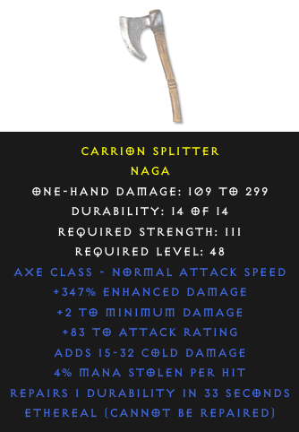 Required Level: 48+83 to Attack Rating+347% Enhanced DamageAdds Cold DamageRepairs Durability4% Mana stolen per hit+2 to Minimum Damage