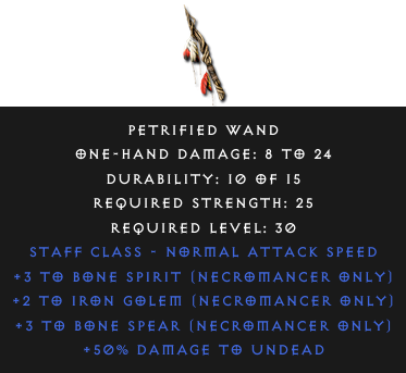 Required Level: 30+3 to Bone Spirit (Necromancer only)+3 to Bone Spear (Necromancer only)+50% Damage to Undead