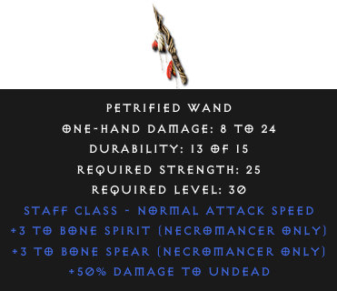 Required Level: 30+3 to Bone Spirit (Necromancer only)+3 to Bone Spear (Necromancer only)+50% Damage to Undead