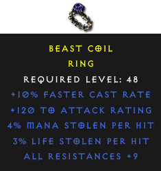 Required Level: 48+10% Faster Cast RateAll Resistances +9+120 to Attack Rating3% Life stolen per hit4% Mana stolen per hit