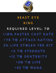 Required Level: 70+10% Faster Cast Rate+2 to Strength+12 to Dexterity+78 to Attack Rating+20 to Life2% Life stolen per hit+82 to Mana