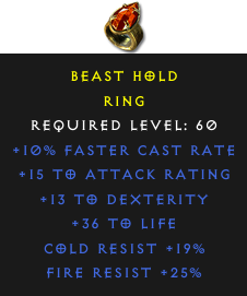 Required Level: 60+10% Faster Cast Rate+13 to Dexterity+15 to Attack Rating+36 to LifeCold Resist +19%Fire Resist +25%