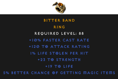 Required Level: 88+10% Faster Cast Rate+23 to Strength+120 to Attack Rating5% Better Chance of Getting Magic Items+19 to Life1% Life stolen per hit