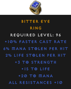 Required Level: 96+10% Faster Cast Rate+3 to StrengthAll Resistances +10+15 to Life2% Life stolen per hit6% Mana stolen per hit+20 to Mana