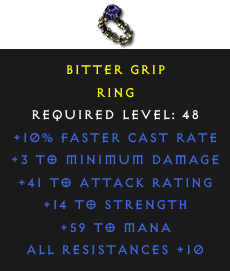 Required Level: 48+10% Faster Cast Rate+14 to StrengthAll Resistances +10+41 to Attack Rating+3 to Minimum Damage+59 to Mana