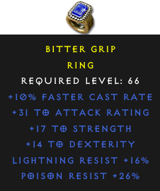 Required Level: 66+10% Faster Cast Rate+17 to Strength+14 to Dexterity+31 to Attack RatingPoison Resist +26%Lightning Resist +16%