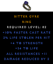 Required Level: 82+10% Faster Cast Rate+4 to StrengthAll Resistances +11+54 to Life2% Life stolen per hitDamage Reduced by 2