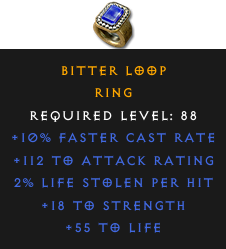 Required Level: 88+10% Faster Cast Rate+18 to Strength+112 to Attack Rating+55 to Life2% Life stolen per hit