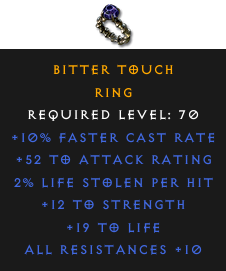 Required Level: 70+10% Faster Cast Rate+12 to StrengthAll Resistances +10+52 to Attack Rating+19 to Life2% Life stolen per hit