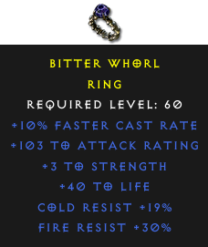 Required Level: 60+10% Faster Cast Rate+3 to Strength+103 to Attack Rating+40 to LifeCold Resist +19%Fire Resist +30%