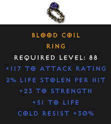 Required Level: 88+23 to Strength+117 to Attack Rating+51 to LifeCold Resist +30%2% Life stolen per hit