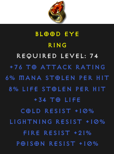Required Level: 74+76 to Attack Rating+34 to LifePoison Resist +10%Cold Resist +10%Lightning Resist +10%Fire Resist +21%8% Life stolen per hit6% Mana stolen per hit