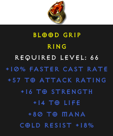 Required Level: 66+10% Faster Cast Rate+16 to Strength+57 to Attack Rating+14 to LifeCold Resist +18%+80 to Mana