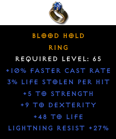 Required Level: 65+10% Faster Cast Rate+5 to Strength+9 to Dexterity+48 to LifeLightning Resist +27%3% Life stolen per hit