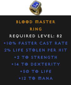 Required Level: 82+10% Faster Cast Rate+2 to Strength+14 to Dexterity+50 to Life2% Life stolen per hit+12 to Mana