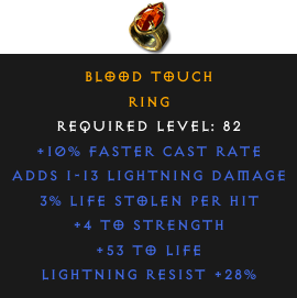 Required Level: 82+10% Faster Cast Rate+4 to Strength+53 to LifeLightning Resist +28%Adds Damage3% Life stolen per hit
