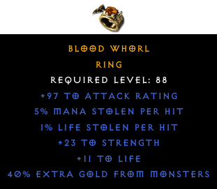 Required Level: 88+23 to Strength+97 to Attack Rating+11 to Life1% Life stolen per hit5% Mana stolen per hit40% Extra Gold from Monsters