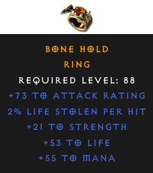 Required Level: 88+21 to Strength+73 to Attack Rating+53 to Life2% Life stolen per hit+55 to Mana