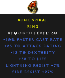 Required Level: 60+10% Faster Cast Rate+12 to Dexterity+85 to Attack Rating+38 to LifeLightning Resist +7%Fire Resist +27%