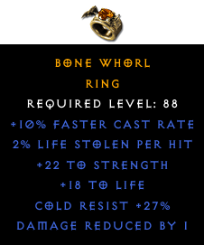 Required Level: 88+10% Faster Cast Rate+22 to Strength+18 to LifeCold Resist +27%2% Life stolen per hitDamage Reduced by 1