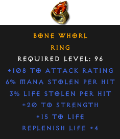 Required Level: 96+20 to StrengthReplenish Life +4+108 to Attack Rating+15 to Life3% Life stolen per hit6% Mana stolen per hit
