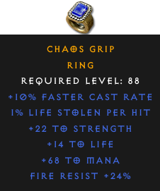 Required Level: 88+10% Faster Cast Rate+22 to Strength+14 to LifeFire Resist +24%1% Life stolen per hit+68 to Mana