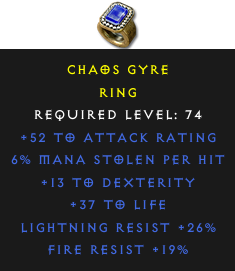 Required Level: 74+13 to Dexterity+52 to Attack Rating+37 to LifeLightning Resist +26%Fire Resist +19%6% Mana stolen per hit