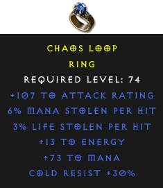 Required Level: 74+107 to Attack RatingCold Resist +30%3% Life stolen per hit6% Mana stolen per hit+73 to Mana+13 to Energy