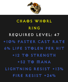 Required Level: 47+10% Faster Cast Rate+12 to StrengthLightning Resist +13%Fire Resist +24%6% Life stolen per hit+52 to Mana
