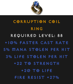 Required Level: 88+10% Faster Cast Rate+22 to Strength+20 to LifeFire Resist +27%3% Life stolen per hit5% Mana stolen per hit
