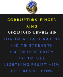 Required Level: 60+10 to Strength+14 to Dexterity+116 to Attack Rating+31 to LifeLightning Resist +19%Fire Resist +30%