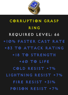 Required Level: 66+10% Faster Cast Rate+18 to Strength+83 to Attack Rating+40 to LifePoison Resist +7%Cold Resist +7%Lightning Resist +7%Fire Resist +31%