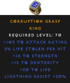 Required Level: 70+18 to Strength+15 to Dexterity+103 to Attack Rating+20 to LifeLightning Resist +20%2% Life stolen per hit