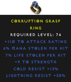 Required Level: 74+9 to Strength+110 to Attack RatingCold Resist +13%Lightning Resist +28%7% Life stolen per hit6% Mana stolen per hit