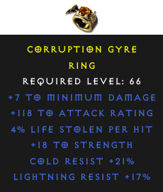 Required Level: 66+18 to Strength+118 to Attack RatingCold Resist +21%Lightning Resist +17%4% Life stolen per hit+7 to Minimum Damage